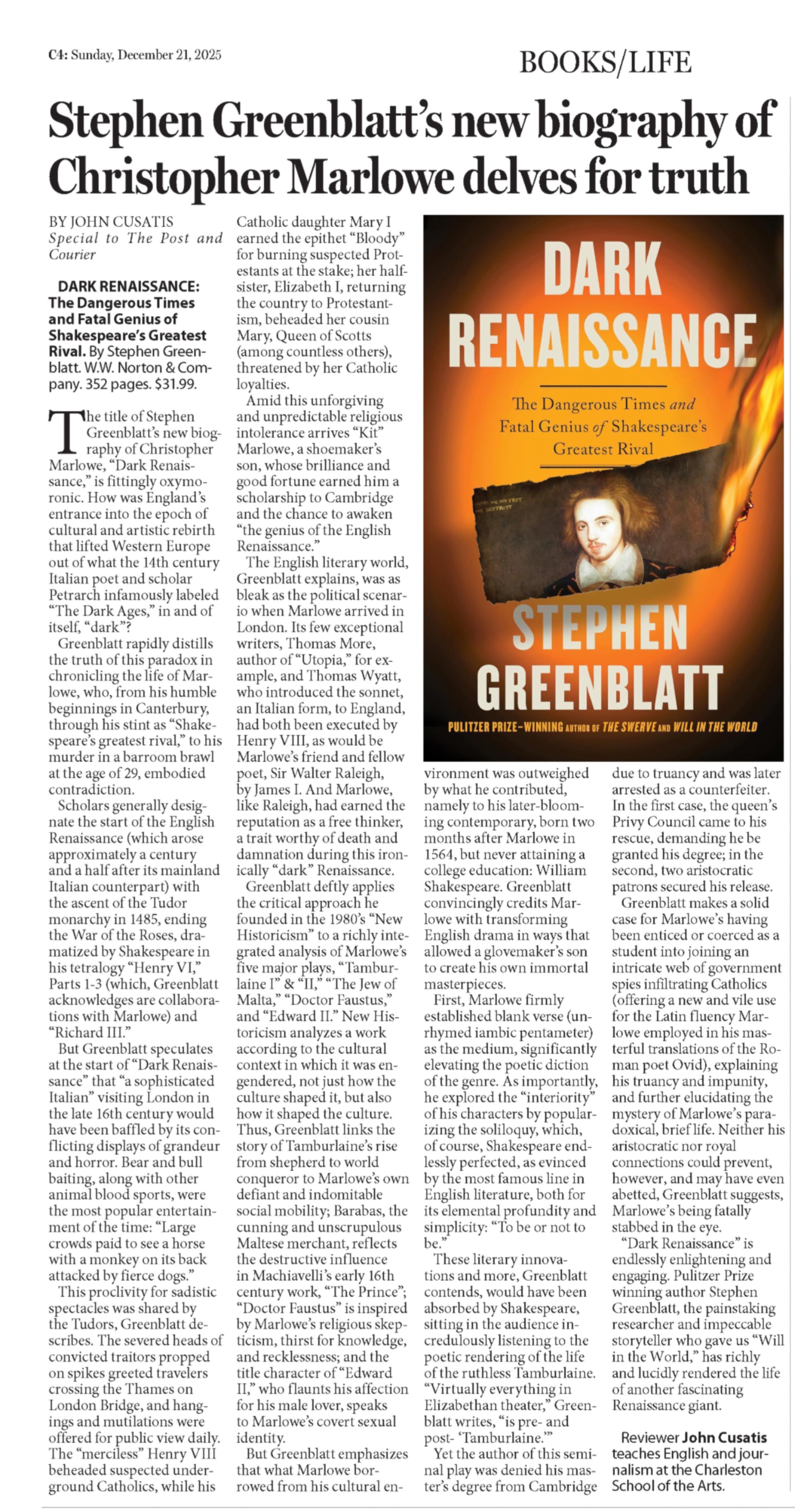 The Post & Courier, Charleston, SC, 21 December 2025 < Home Literary LinksUpcoming Events Publications SOA Applause e-mail: John Cusatis